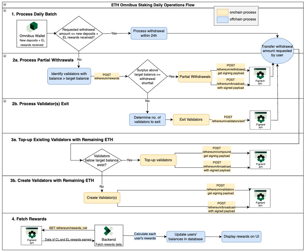 An omnibus setup consolidates multiple users' off-chain staking requests into a single wallet to enhance UX.
