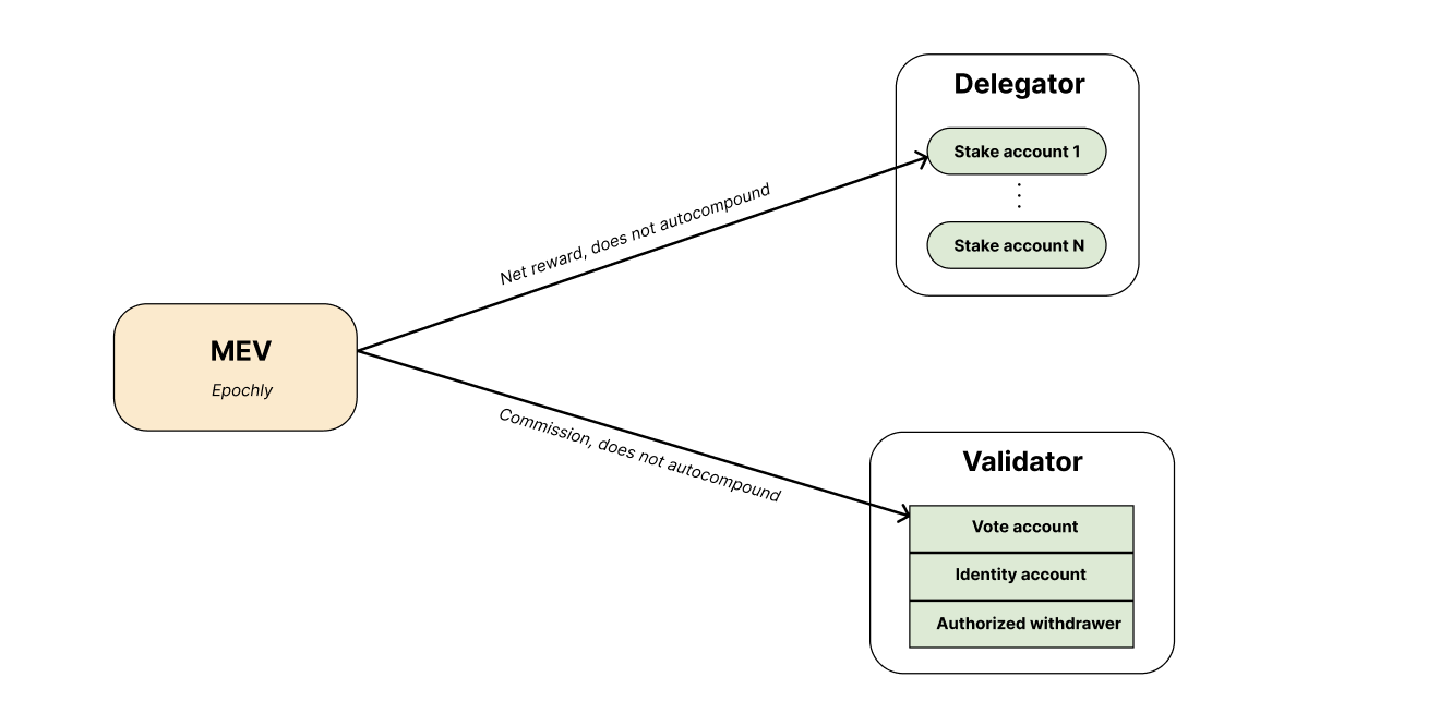 | Accrue inflation and MEV rewards every epoch in the stake account balance | Optional: Periodically withdraw MEV rewards using or |